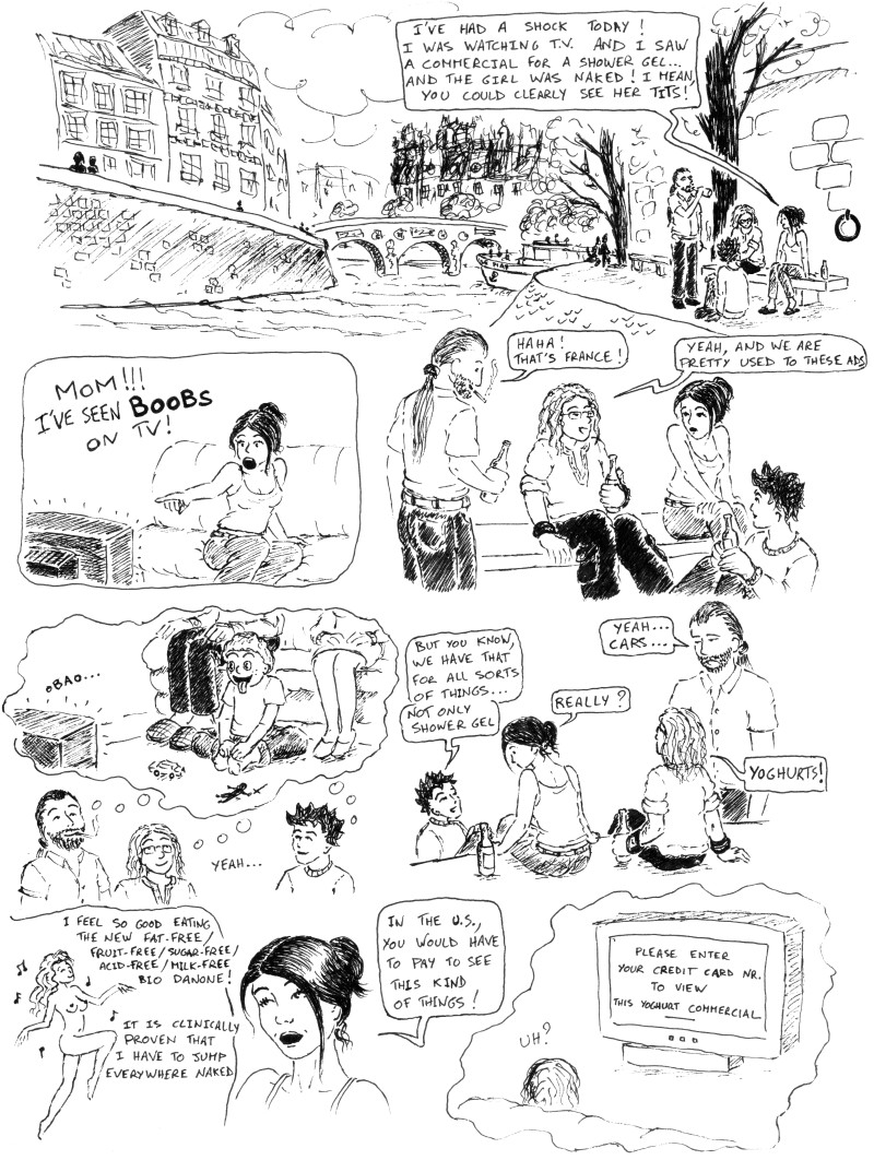 Une petite mise en bd d’une conversation avec une amie américaine qui était à Paris y’a pas longtemps. Vous pouvez cliquer pour une version plus lisible, mais dans tous les cas c’est en VO.