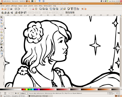 Pendant la réalisation de mon dernier dessin, j’ai fait des scans à différentes étapes, dont celle du trait encré. Cette étape est vraiment la plus sympa du processus pour un dessin comme celui-ci. C’est tout propre et ça a déjà le goût d’un truc achevé. Un peu comme un dessin fini avant le dessin fini. Et on peut se poser un moment pour apprécier son boulot, avant de se lancer dans la phase de mise en couleur qui a de grandes chances de tout foutre en l’air :P. Mais surtout, on peut la bidouiller plus facilement que l’étape finale, par exemple en passant l’image à la moulinette Potrace dans Inkscape1.