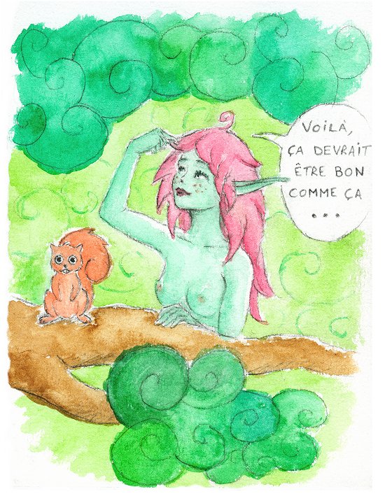 Pour la technique, c’est dans la même veine que mes deux essais précédents style Art Nouveau. Ligne claire, commencée au crayon puis repassée à l’encre de chine marron, avec épaisseur accentuée pour le détour des personnages, puis coloriage par surfaces unies. Sauf que là, pas voulu gâcher le tout par un aquarellage loupé, donc coloriage direct dans Gimp.