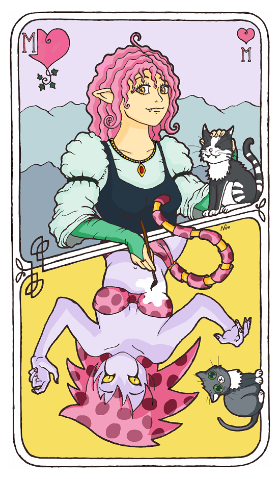 Après, pour le style en lui-même, c’est mâtiné à la sauce manga-like de Maliki. D’ailleurs, je regrette assez de ne pas avoir plus laissé parlé mon style personnel là-dedans, ça ressemble beaucoup trop à l’original (surtout Lady Bird et Fëanor, en bas). C’est peut-être là-dessus que ça a pêché du point de vue du jury. Ou sur le coup de la carte à jouer: dont le concept, pour une raison obscure, a été juste à moitié réalisé. Tant pis ;) Et puis, finalement, c’est pas plus mal, déjà qu’Ivy était jalouse…