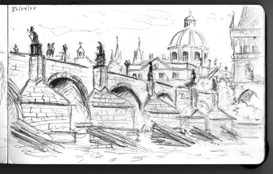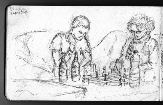 Décidément, je suis toujours aussi lent pour pondre un billet digne de ce nom. Alors, en attendant Bratislava, voilà le fameux pont Charles de Prague et un couple d’Allemands qui jouait aux échecs à l’hôtel, très vaguement saisi “sur le vif” (et tout crasseux parce que mon carnet a pris cher et que les pages ont frotté l’une contre l’autre…)