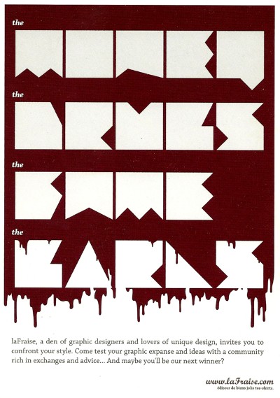 2009-02-10_flyer_la_fraise.jpg, fév. 2009Voici une espèce de flyer branchouille pour le site de t-shirts la Fraise, que Nacara et Abie m’ont montré mercredi dernier. Petit jeu : arriverez-vous à déchiffrer les quatre mots qui sont marqués là-dessus ? Bonus spécial si vous y arrivez en moins de 2 minutes (ça sera mieux que moi, et j’étais aidé) et sans avoir mal aux yeux… En tout cas, je crois que ça bat tous les jeux de déchiffrage de logos de groupes de Black Metal que je veux faire depuis longtemps. Même pas besoin de barbelés ou de pentacles.