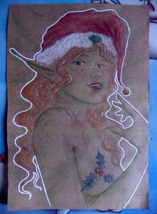 Pour pas être complètement à la bourre cette année, une petite Ivy rapide dans l’ambiance actuelle, sur une chute de papier cadeau :) Ce qui m’a permis de constater que le papier Kraft est un support qui résiste de façon assez surprenante à beaucoup d’outrages…