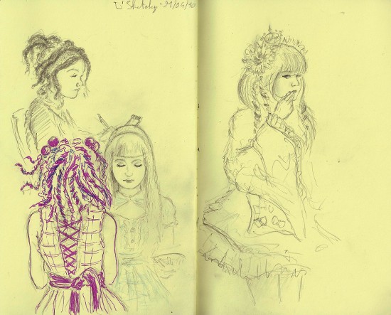 Et hop, voici mes dessins de la séance de Dr Sketchy de la semaine dernière, sur le thème “Gothic Lolita”.
