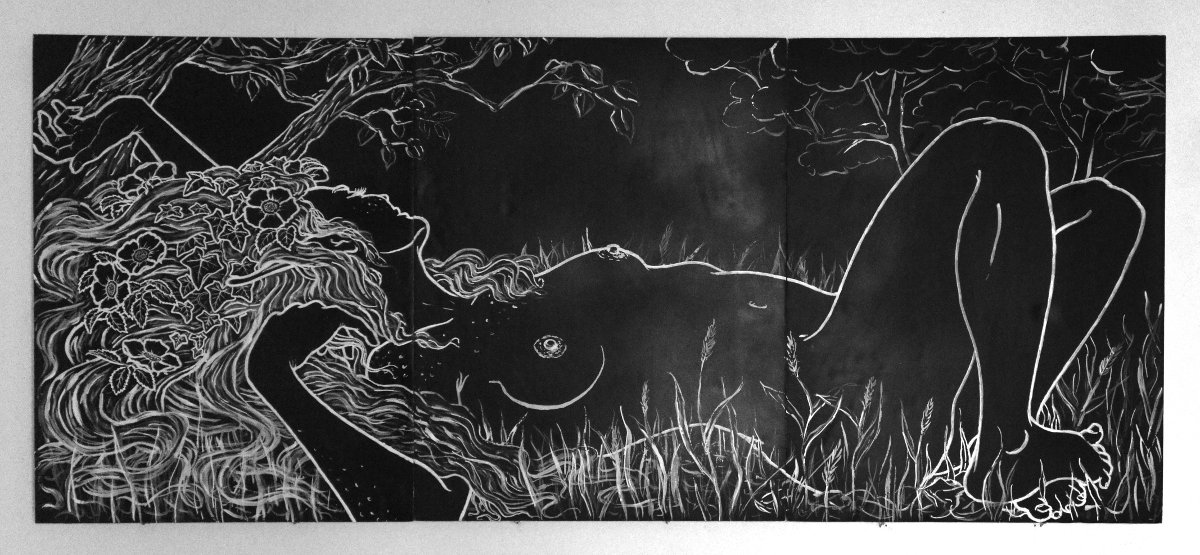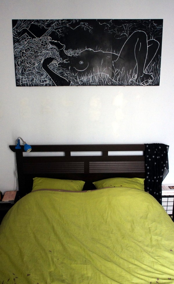 Ces trois plaques de polystyrène recouvertes d’une couche noire (et blanche au verso) traînaient chez moi depuis bientôt deux ans. Je les avais récupérées à mon boulot, juste avant qu’elles soient jetées pendant un grand rangement des bureaux. Je n’avais pas d’idée précise de quoi en faire, j’ai réfléchi à un triptyque mais rien ne venait, alors j’ai juste peint le sujet qui ne me demande pas vraiment d’effort. Mais je crois que c’est ce que j’ai fait de plus grand à ce jour (sans compter les calmars et cachalots sur le sable :)).