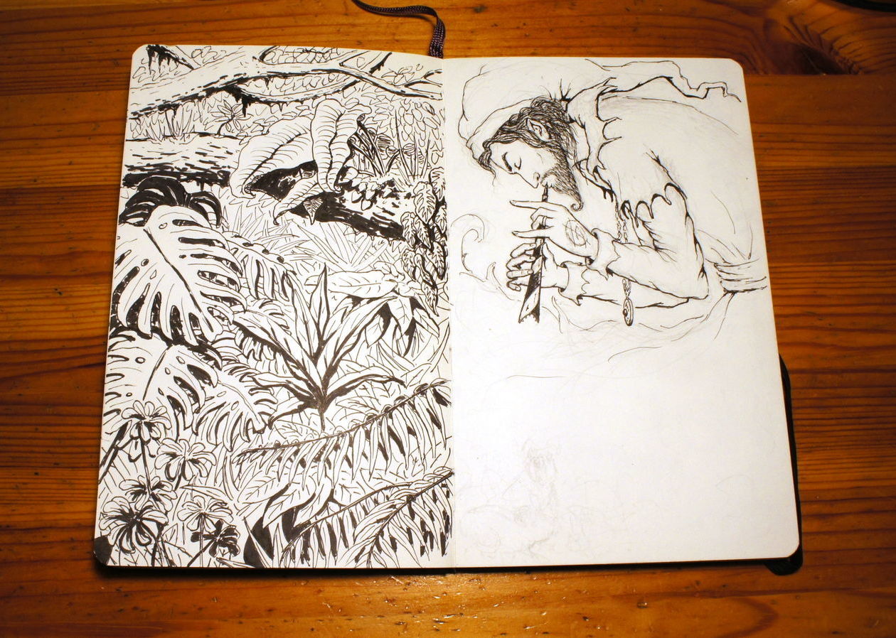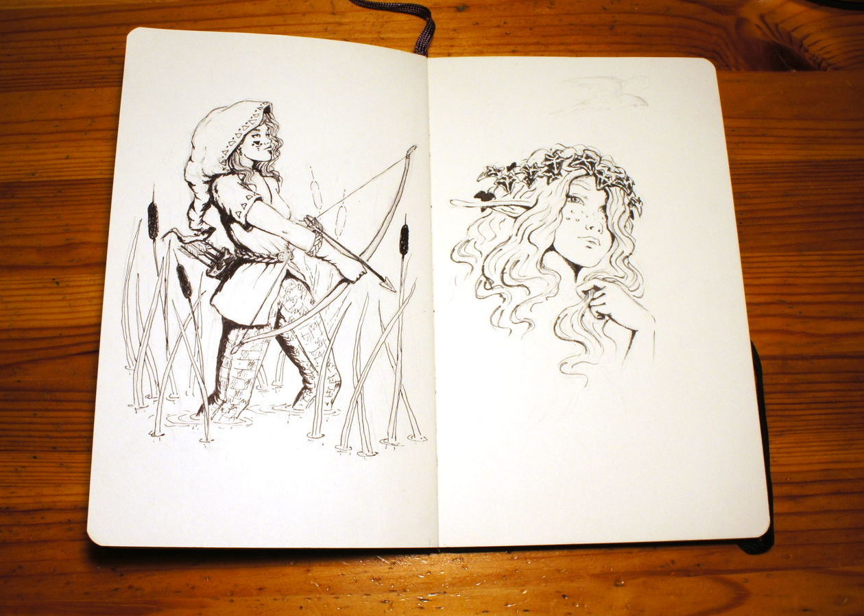 Mais à côté de cela, ce fut l’occasion parfaite d’expérimenter plein de choses, de faire des études pour des projets plus gros, et d’explorer quelques thèmes qui traînaient dans ma todo list depuis plusieurs années parfois (ex: le Berger et la Ramoneuse, le joueur de flûte inachevé, la Jeune fille et la Mort). Et j’avoue que ces quelques pages successives dans mon carnet ont belle allure.