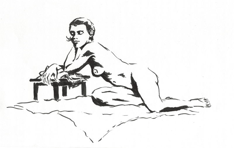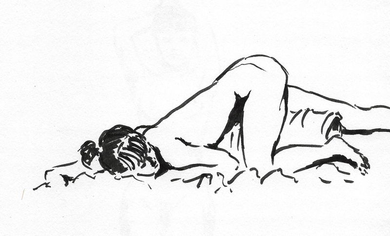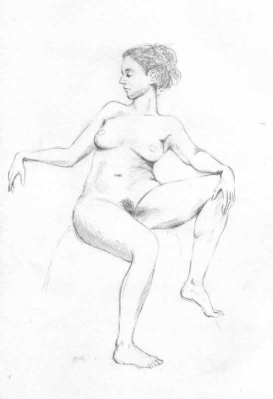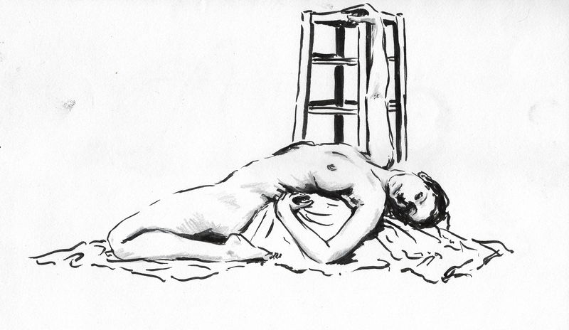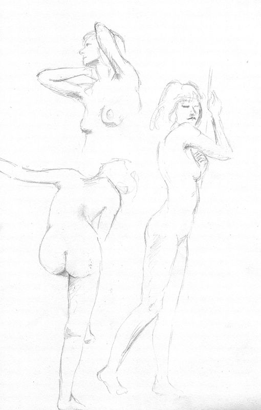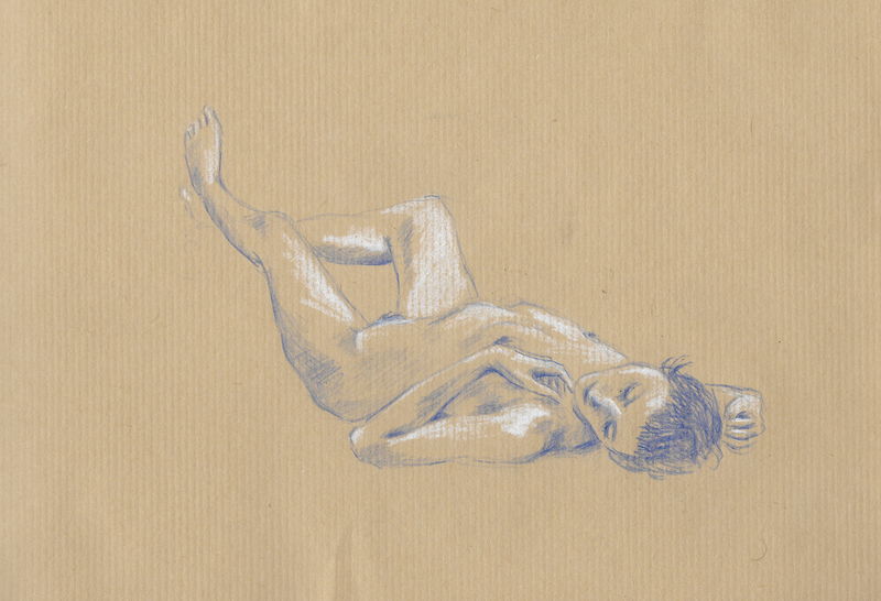 Depuis un mois, ce manque est réparé. Je passe maintenant mes mercredis soir dans un vieil atelier bien académique à dessiner des modèles nus. Ce sont des séances libres, sans prof, avec toujours les mêmes cadences de poses d’une semaine sur l’autre. C’est calme, difficile mais pas stressant, presque méditatif, et ça semble porter des fruits rapidement. Je me maudis de ne pas avoir tenté l’expérience plus tôt. Même si je ne me lâche pas encore beaucoup sur les techniques et les approches, je tente quand même des choses, je me confronte à de vieux blocages, et je suis souvent content de ce que j’obtiens. Je suis surtout curieux de voir quel effet cette pratique aura sur mes dessins en général.