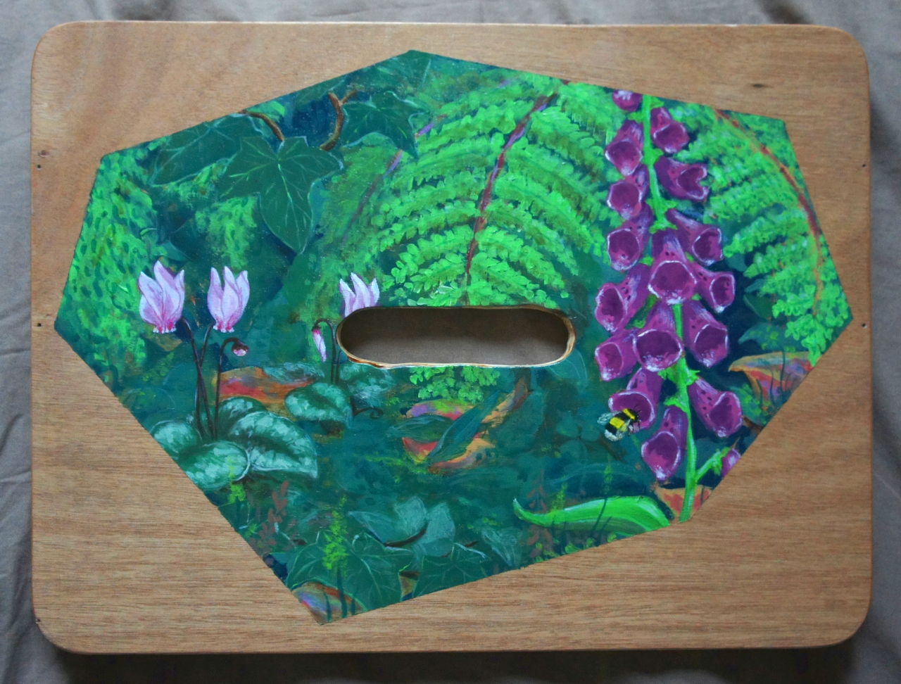 C’est toujours chouette de faire de la déco, mais surtout ça fait quelque temps que j’ai envie de me mettre vraiment à la peinture, pour des choses plus colorées sur des plus grands formats, notamment du bois. Alors il faut que je fasse des tests. Ce couvercle que j’avais bricolé avec du contreplaqué de récup faisait bien l’affaire. J’ai ainsi pu tâter un peu de l’acrylique, du medium, du gesso transparent, du vernis satiné, et de toutes leurs propriétés capricieuses.
