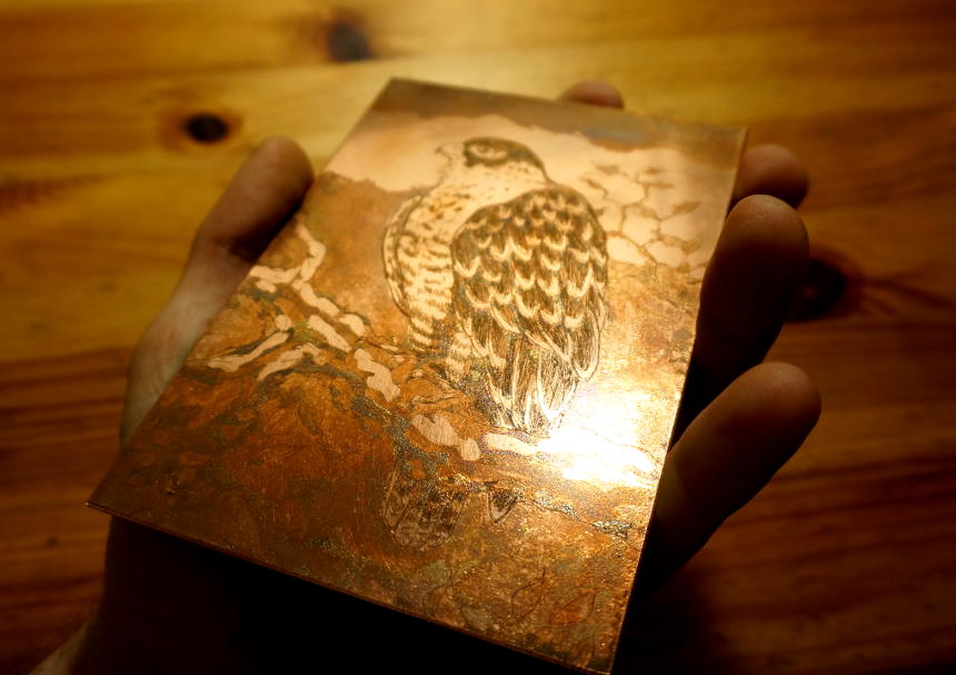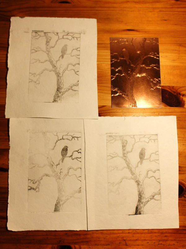 Le résultat final est celui en début d’article. J’ai adoré le voir sortir de la presse, mais je ne peux pas m’empêcher de voir tous ses problèmes. J’ai été quelque peu pris au dépourvu par la complexité du processus de l’aquatinte : planifier les niveaux de gris à l’avance et penser leur exécution “à l’envers”. Dans la confusion des couches de vernis qui masquaient de plus en plus le trait originel, j’ai perdu les feuillages et j’ai fait n’importe quoi sur la branche. Mais je ne perds pas de vue que c’était un tout premier essai, en temps assez limité, pour découvrir la technique. Maintenant que je vois comment tout ça fonctionne, je n’ai plus qu’à me lancer dans de nouvelles gravures, chez moi ou à l’atelier. Vivement la prochaine !