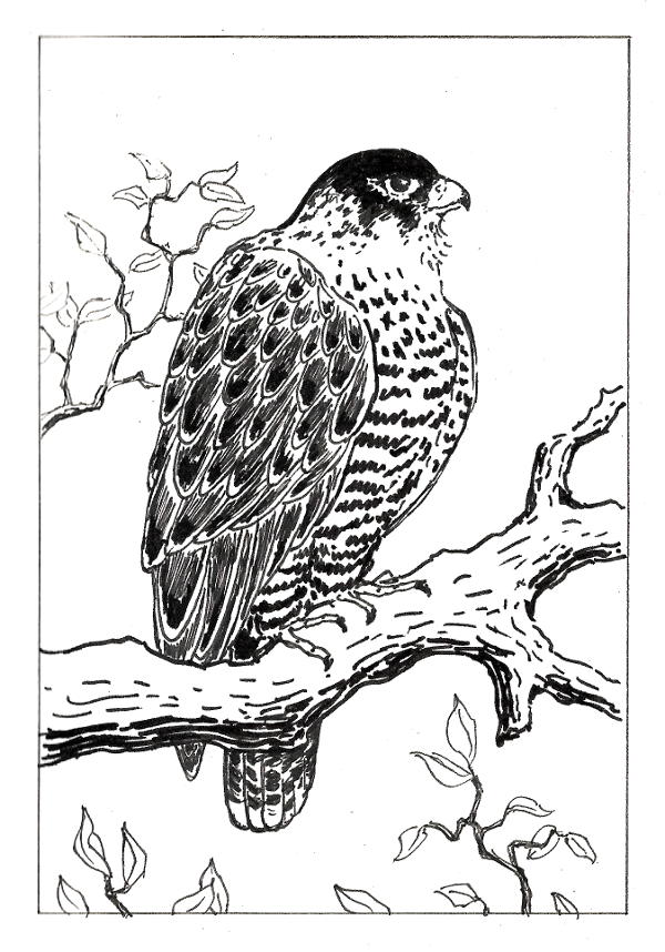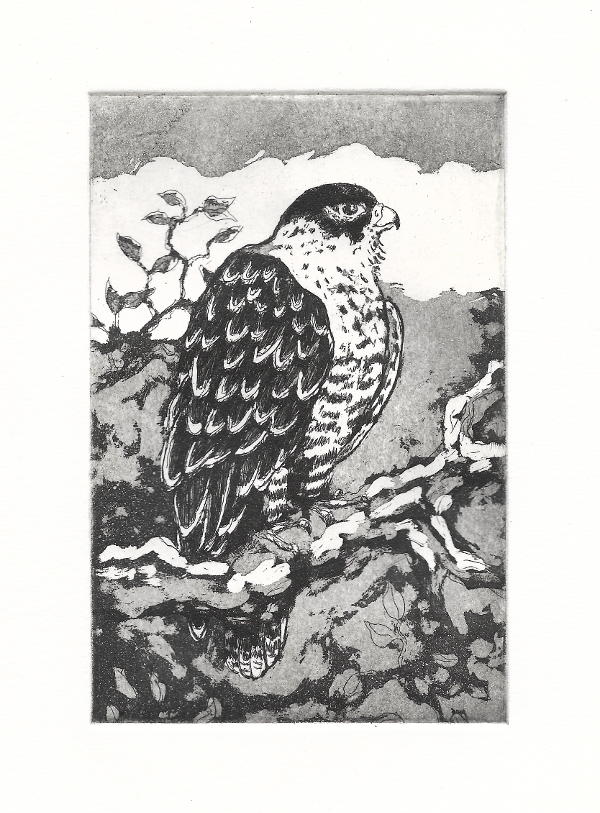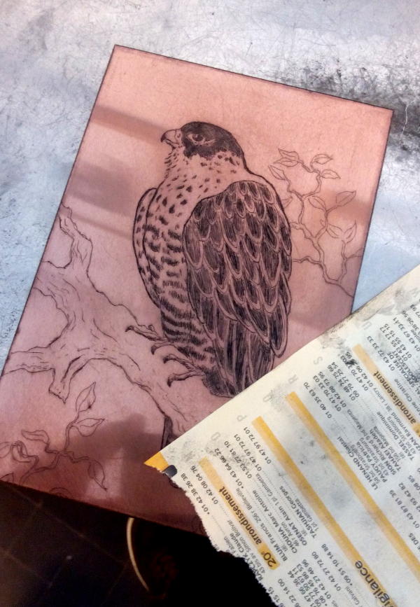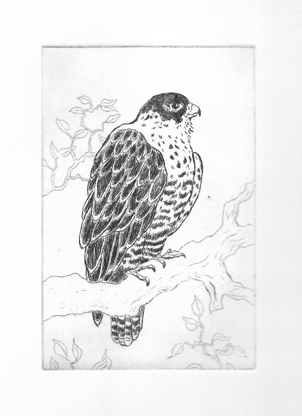 Faucon pélerin, eau-forte. (Normalement c’est pas flou sur les bords mais mon scanner a apparemment eu du mal avec la belle dépression dans le papier due à la pression de la plaque)