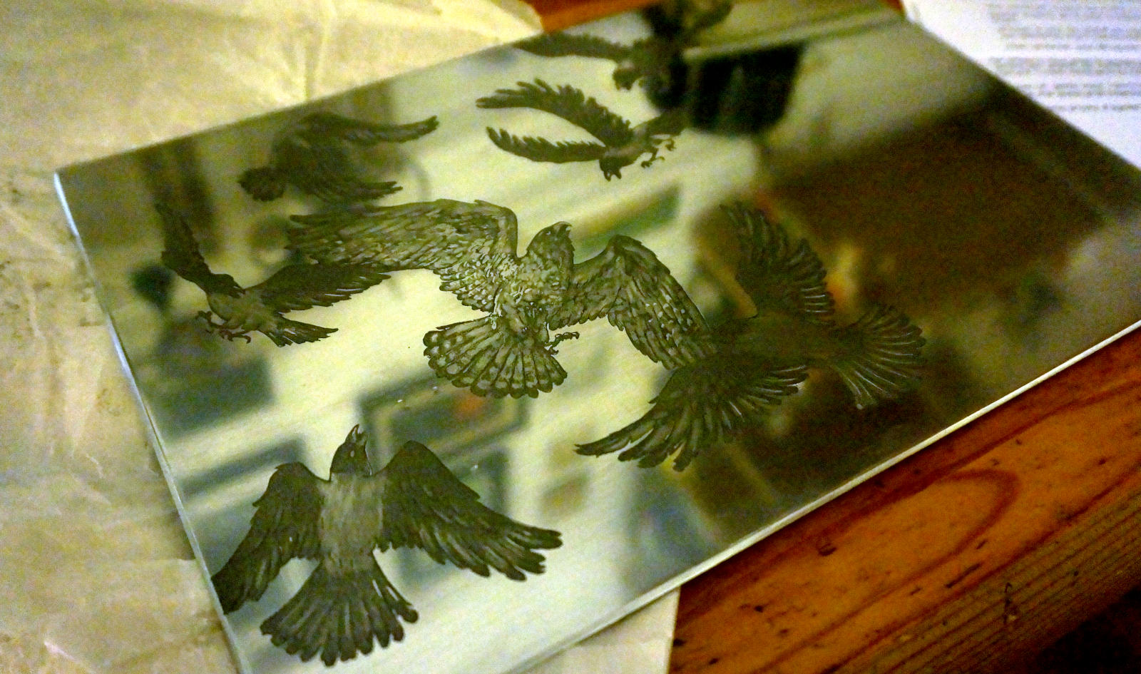 Sinon, ça fait partie de ces quelques gravures pour lesquelles je préfère la plaque en elle-même au résultat imprimé, parce que ça a été plein de petites frustrations de rendus insatisfaisants. Du coup, voilà une petite photo du zinc.