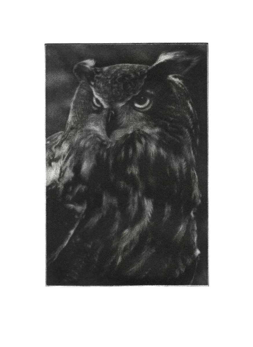 Et surtout, la manière noire reste une technique superficielle, contrairement à une eau-forte très mordue par exemple. Le cuivre gravé s’émousse donc assez vite au fil des passages sous presse. Je l’ai constaté au bout d’une trentaine de tirages du hibou.