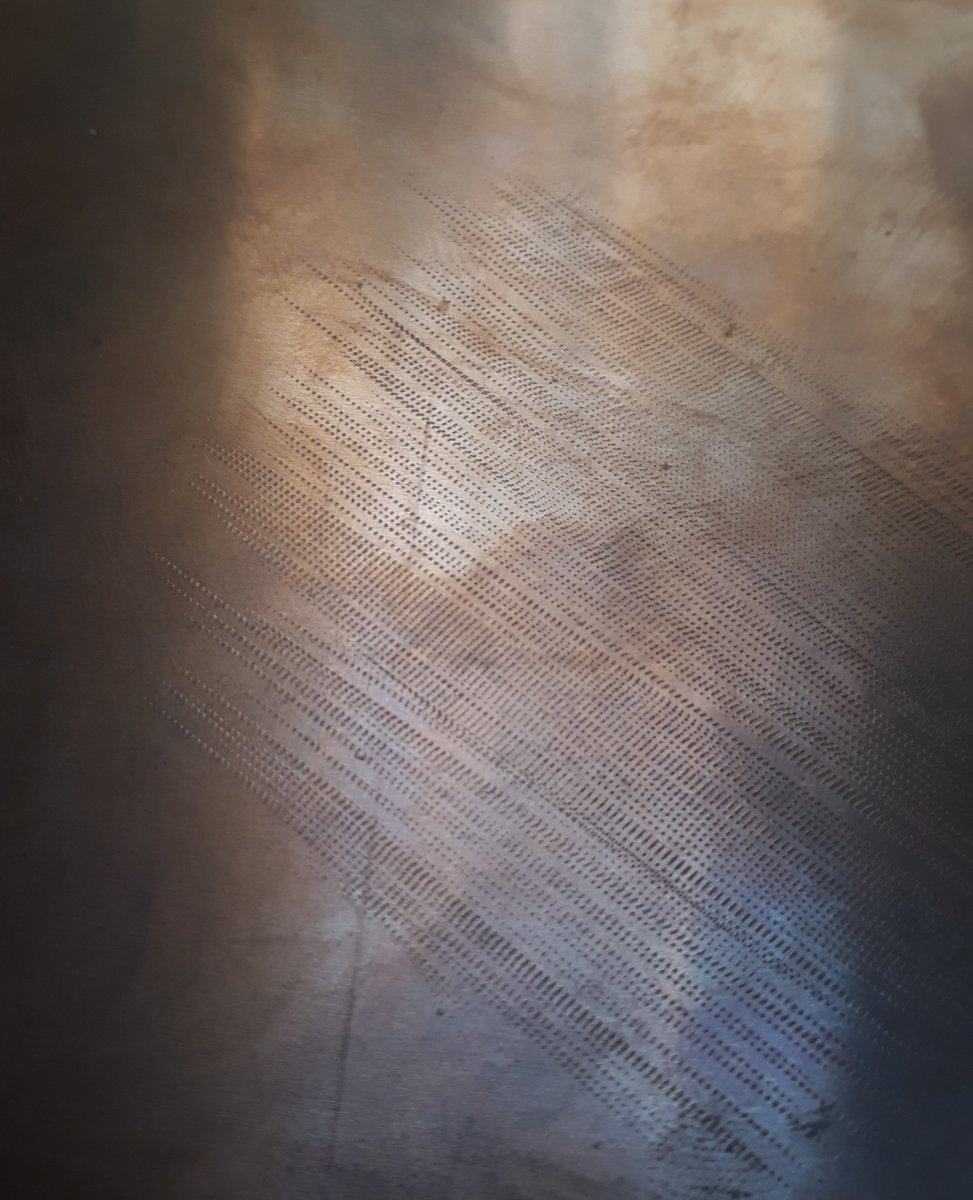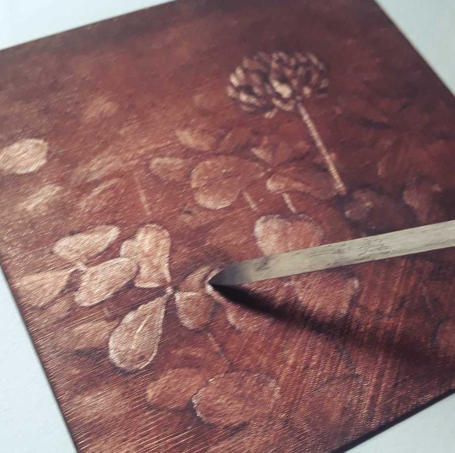 Cela donnera une texture rugueuse qu’on peut travailler de la même façon au grattoir/brunissoir. On parle de “fausse” manière noire, on n’a pas le même contrôle ni la même finesse, mais ça marche très bien quand même. Et fausse ou pas, celle-ci restera ma toute première manière noire !