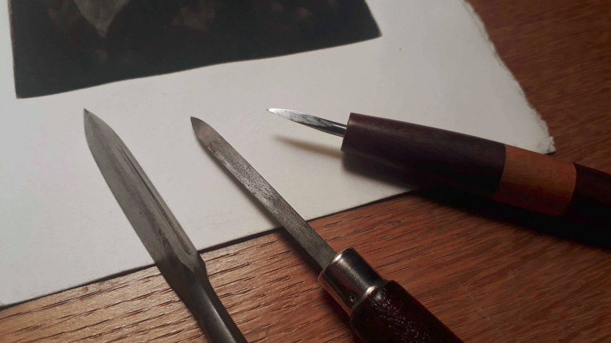 Dans mon thread sur l’aquatinte, j’expliquais la différence entre les techniques “indirectes”, qui font intervenir des solutions chimiques pour attaquer le métal, et les techniques “directes” (ou “sèches”), où on n’emploie que des outils.