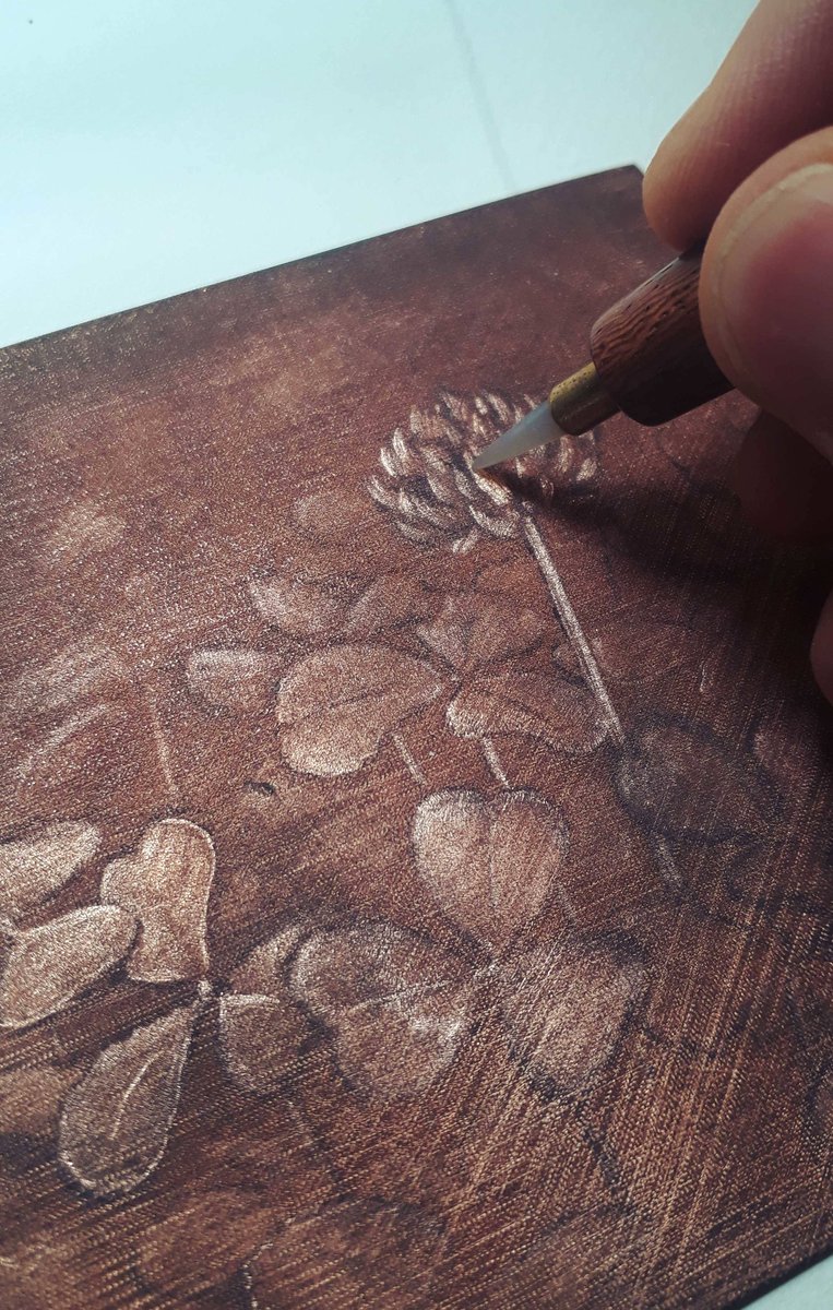 Au passage vous avez pu voir quelques bouts de ma petite plaque en cours : du trèfle. Un truc délicat avec cette technique, c’est que la lumière joue des tours, et je passe mon temps à me tordre le coup ou à changer l’inclinaison de ma lampe pour voir ce que je fais.