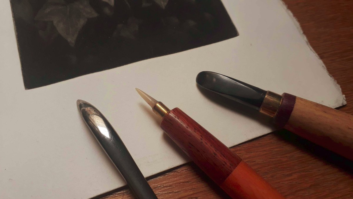 Hormis les berceaux, tous ces outils (grattoir, brunissoir, roulette) ne sont pas spécifiques à la manière noire et servent aussi dans les autres techniques de taille douce. Pour des textures, des corrections, polir les biseaux, etc.