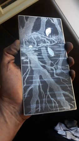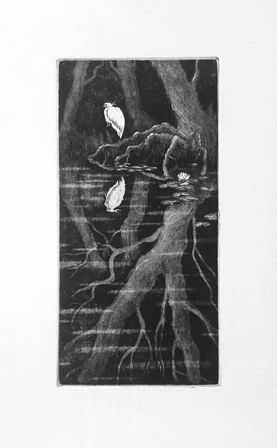 La plaque sur laquelle j’ai passé le plus de temps du stage. Partie d’un croquis jeté rapidement dans un carnet après une rando, où j’avais surpris un Héron cendré perché sur la racine d’un saule au bord d’un étang parfaitement calme. Le reflet du tout était magnifique. Le héron s’est finalement transformé en aigrette pour le contraste.