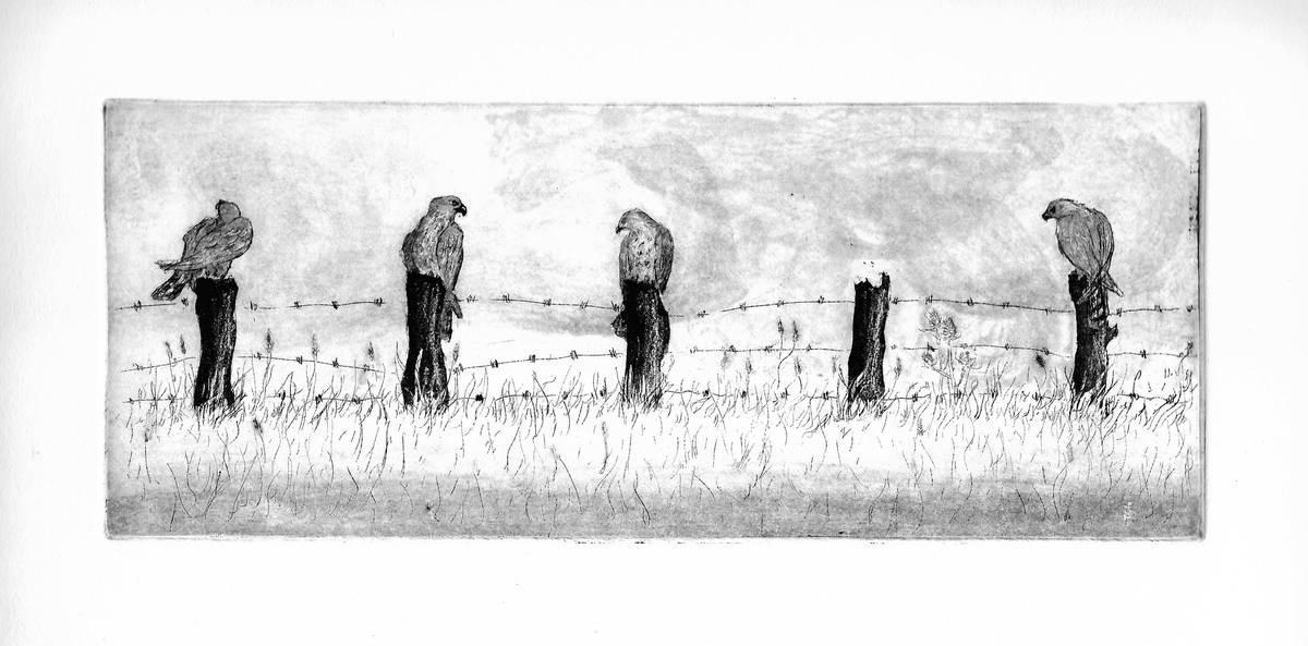 Hommage aux buses qu’on voit sur les bords d’autoroute. Ici, un autre problème d’aquatinte : j’ai voulu traiter le premier plan et le ciel en lavis, en “peignant” directement sur la plaque avec un pinceau trempé dans le mordant pour obtenir un effet nuageux. C’est ce que j’avais fait pour le ciel de cette gravure, et ça avait très bien marché. Sur du cuivre, avec un mordant bien dosé, il faut quelques secondes à peine pour obtenir ce gris, le risque est plutôt de trop le laisser agir et d’avoir un résultat trop sombre. Mais pour ces buses, avec un mordant adouci et la plaque de zinc, je n’ai jamais réussi à obtenir ce que je voulais. Le mordant cessait d’agir très vite. J’y suis revenu plein de fois mais ça finissait par rendre quelque chose d’assez brouillon. J’essaierai de renforcer ça chez moi et je reviendrai sans doute aussi à ce sujet plus tard, car il m’est cher.