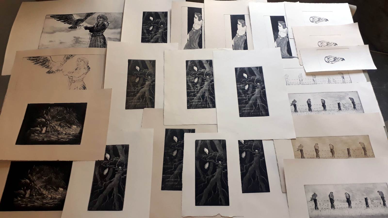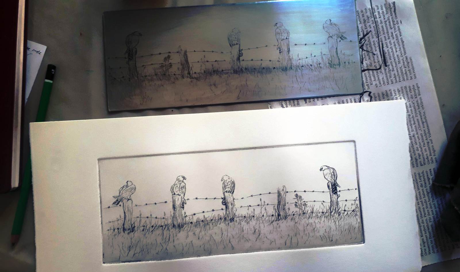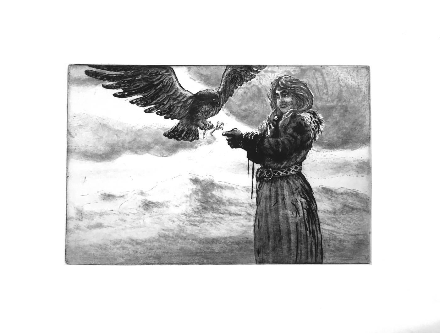 Une grande plaque réalisée en parallèle des buses, en essayant d’être plus spontané. Les gros traits noirs dans les fringues et les ailes ont été tracés directement dans le vernis encore mou avec un bout de bois, complètement l’inverse d’un trait fin et régulier. Ça a permis de structurer le reste avant les traits précis et l’aquatinte. Là aussi j’ai tenté le lavis pour le fond, mais même problème. Ça devrait être moins brouillon pour les nuages et plus précis pour le paysage. Mais c’est pas grave, je peux très bien la retravailler, et ça me permettra de corriger le regard et d’enlever le rouge à lèvres style Joker qui déborde sur la joue de ma fauconnière :).