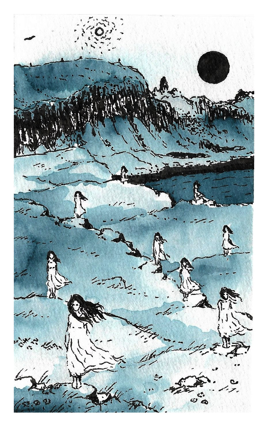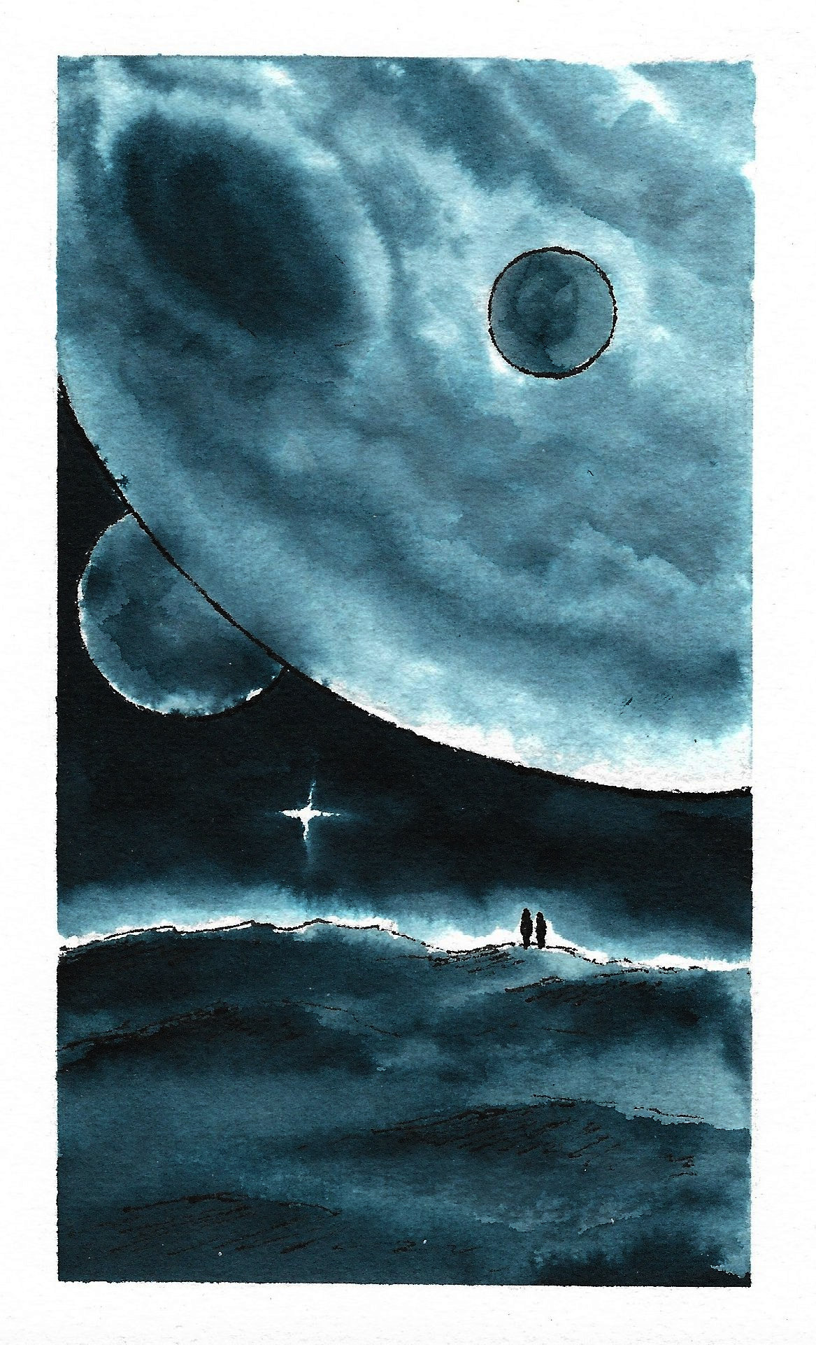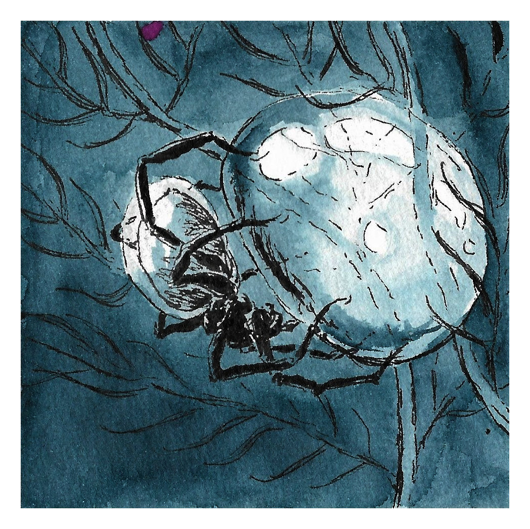 Ça a tout de même été l’occasion d’expérimenter un peu, notamment avec un pinceau à encre que j’aime beaucoup, en Gris de Payne (une couleur que j’adore utiliser en gravure mais qui s’est révélée bien plus bleue dans cette version encre liquide).