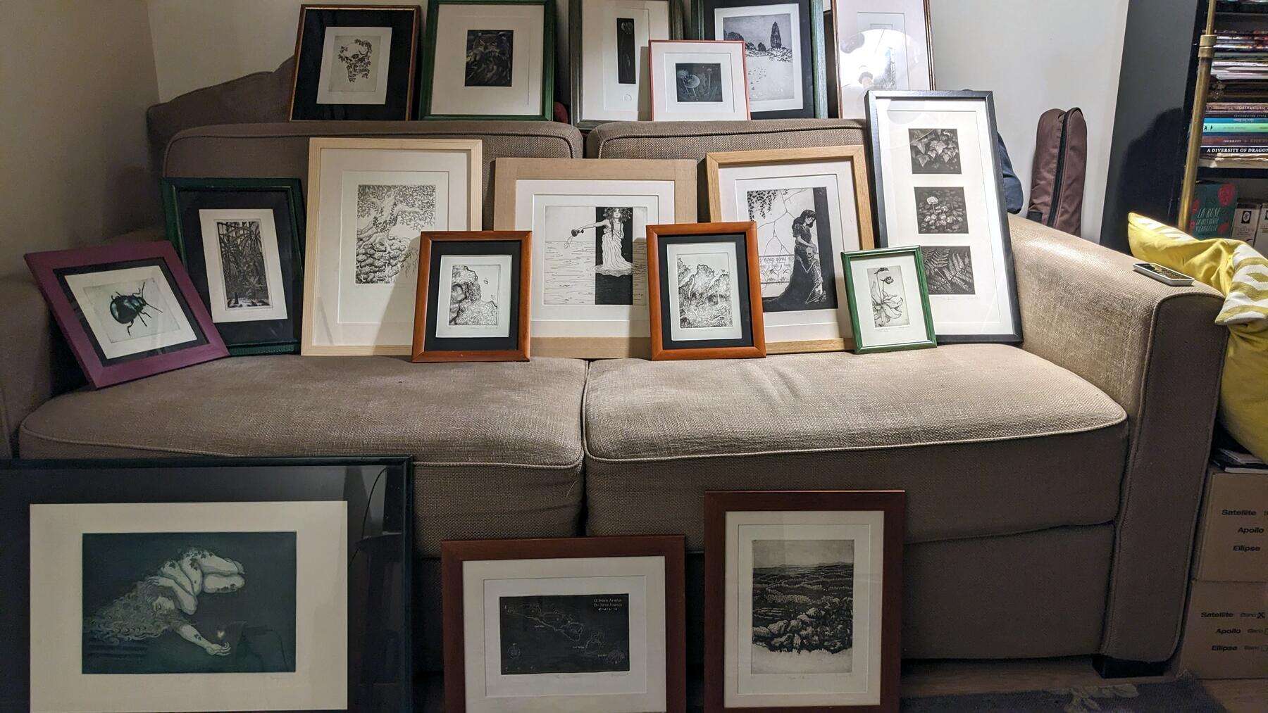 La phase d’encadrement a de loin été la plus prenante, avec son propre lot de décisions. Dans beaucoup d’expos, les cadres montrent une belle unité minimaliste entre toutes les œuvres, pour mieux s’effacer. J’ai hésité à faire ça aussi. Mais en même temps, ça faisait des années que j’entassais des cadres de seconde main récupérés à droite à gauche, alors j’ai décidé d’embrasser ce foutoir dépareillé en cherchant plutôt de belles combinaisons gravure/cadre. Et puis, cette diversité s’accordait bien avec mon papillonnage constant entre les techniques. Pour le reste, j’ai voulu faire dans les règles de l’art, en m’équipant pour découper moi-même les passe-partouts. Tout ça était long mais très satisfaisant.