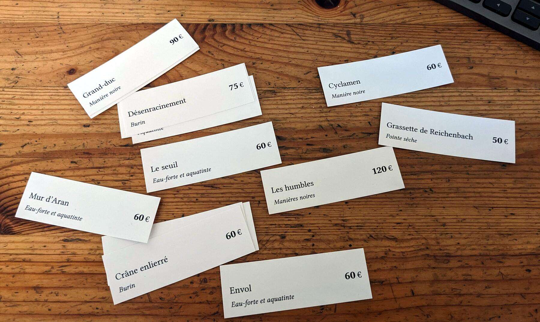 Une semaine, c’est court. Ajouté au côté peu sélectif de l’endroit, ça m’avait amené, bêtement et comme le gros snob paradoxalement jamais sûr de lui que je suis, à minimiser l’événement et à en faire une pub plutôt modeste. Heureusement, la date s’approchant je me suis bien pris au jeu de l’organisation, quand il a fallu tour à tour créer une affiche, faire une sélection finale de gravures à exposer (quitte à refaire de beaux tirages pour l’occasion), les encadrer correctement, donner des prix à tout ça, imprimer de jolies étiquettes, réfléchir à l’arrangement, etc.