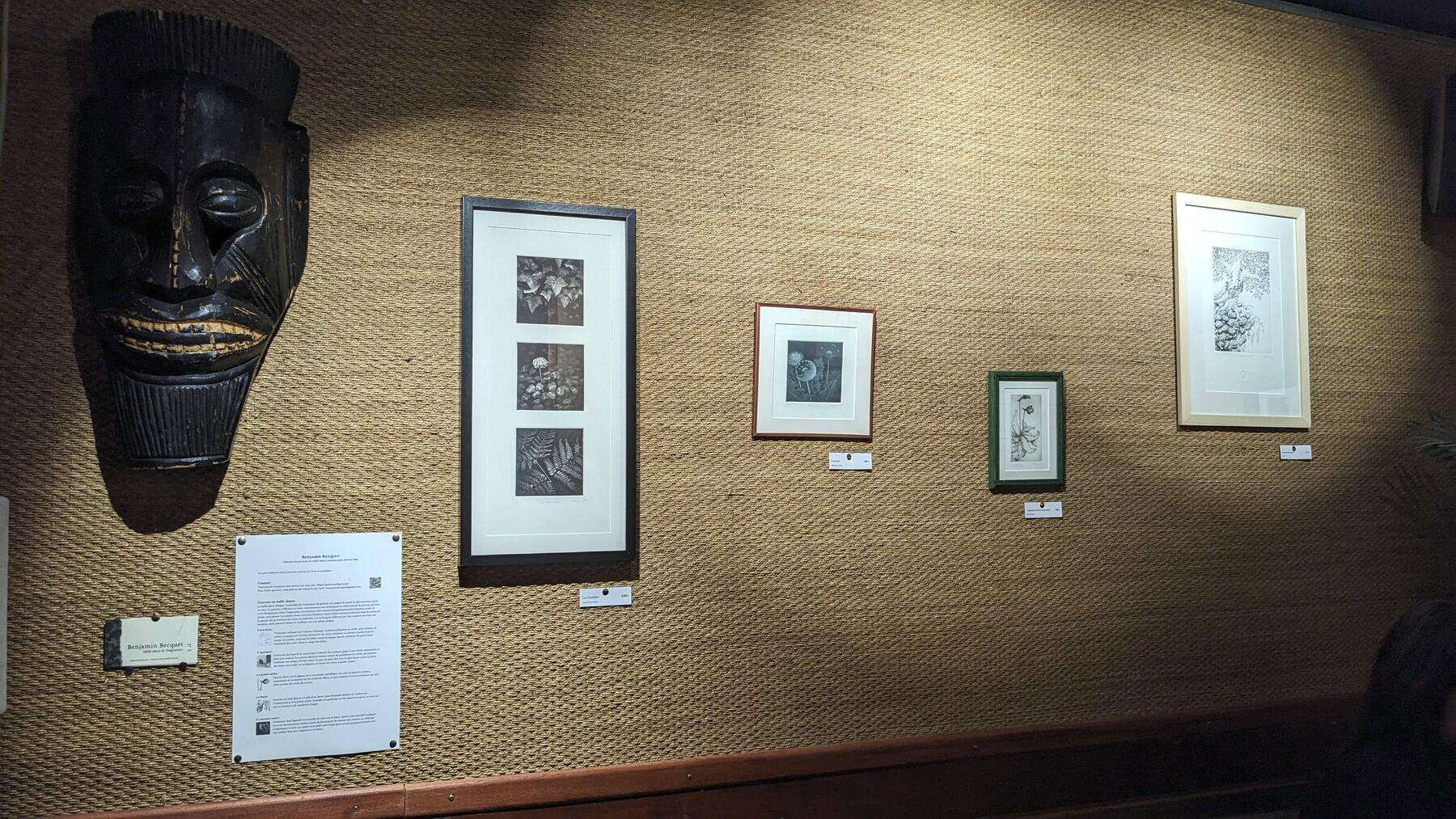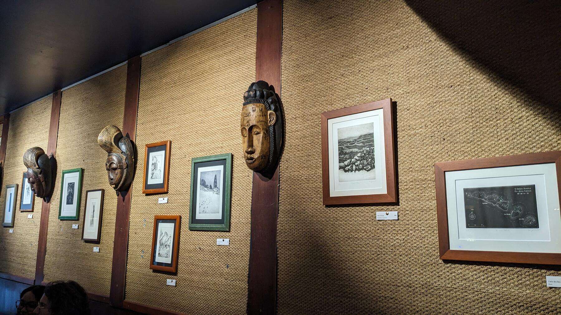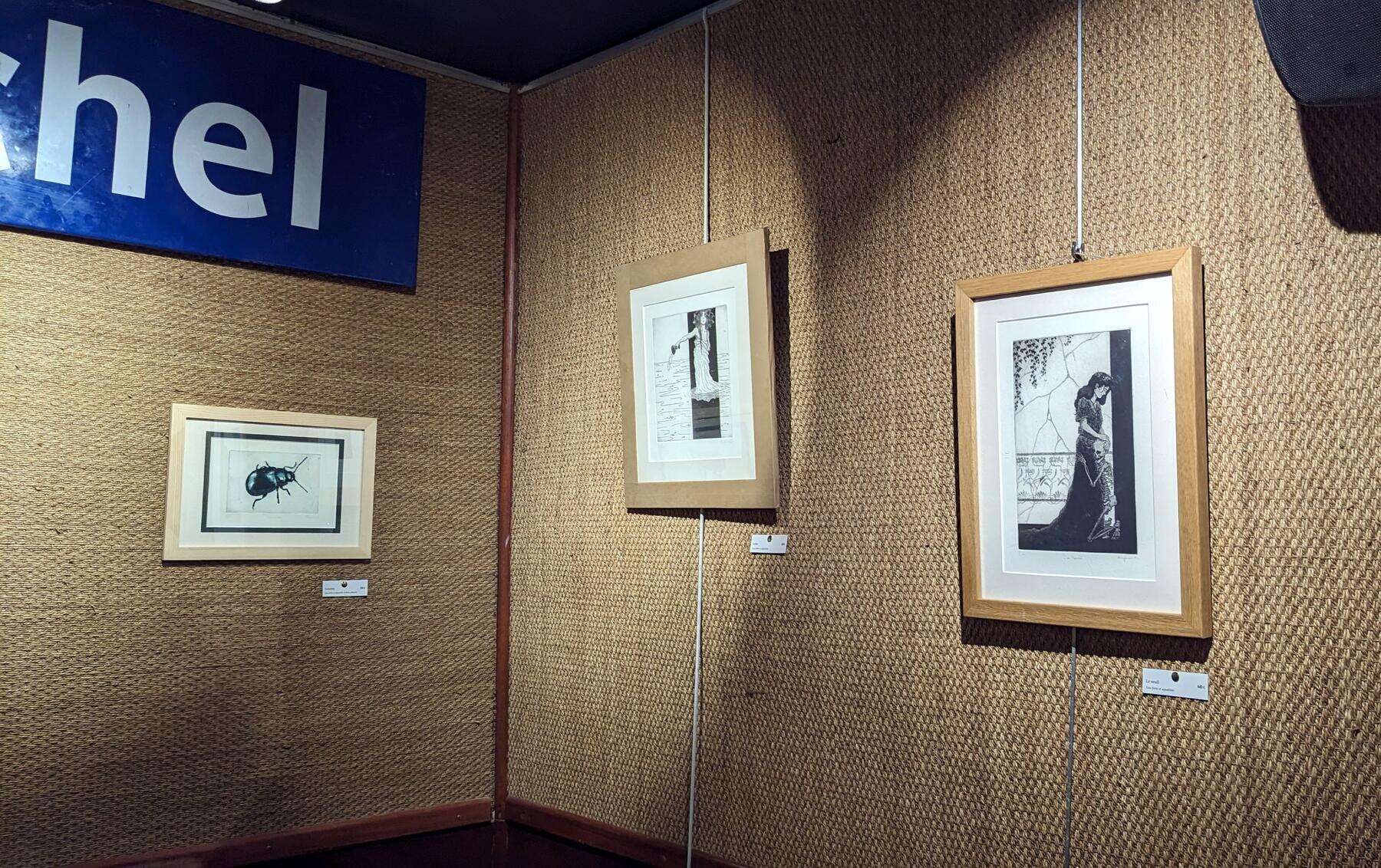 J’avais en tout dix-huit pièces. L’accrochage s’est déroulé sans encombre, en groupant les gravures par sujets proches, de manière assez classique. Le tout était réparti sur un long mur dans l’espace principal du bar et une pièce plus calme au fond. Ça respirait sans être trop espacé, l’éclairage était très bien, globalement ça avait fière allure.