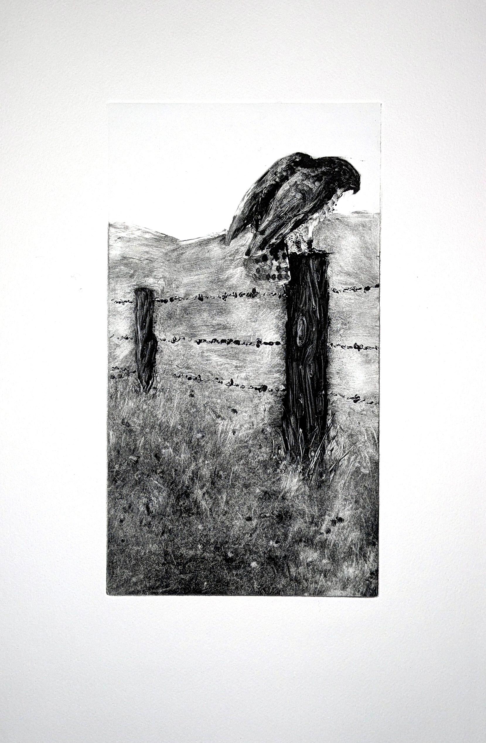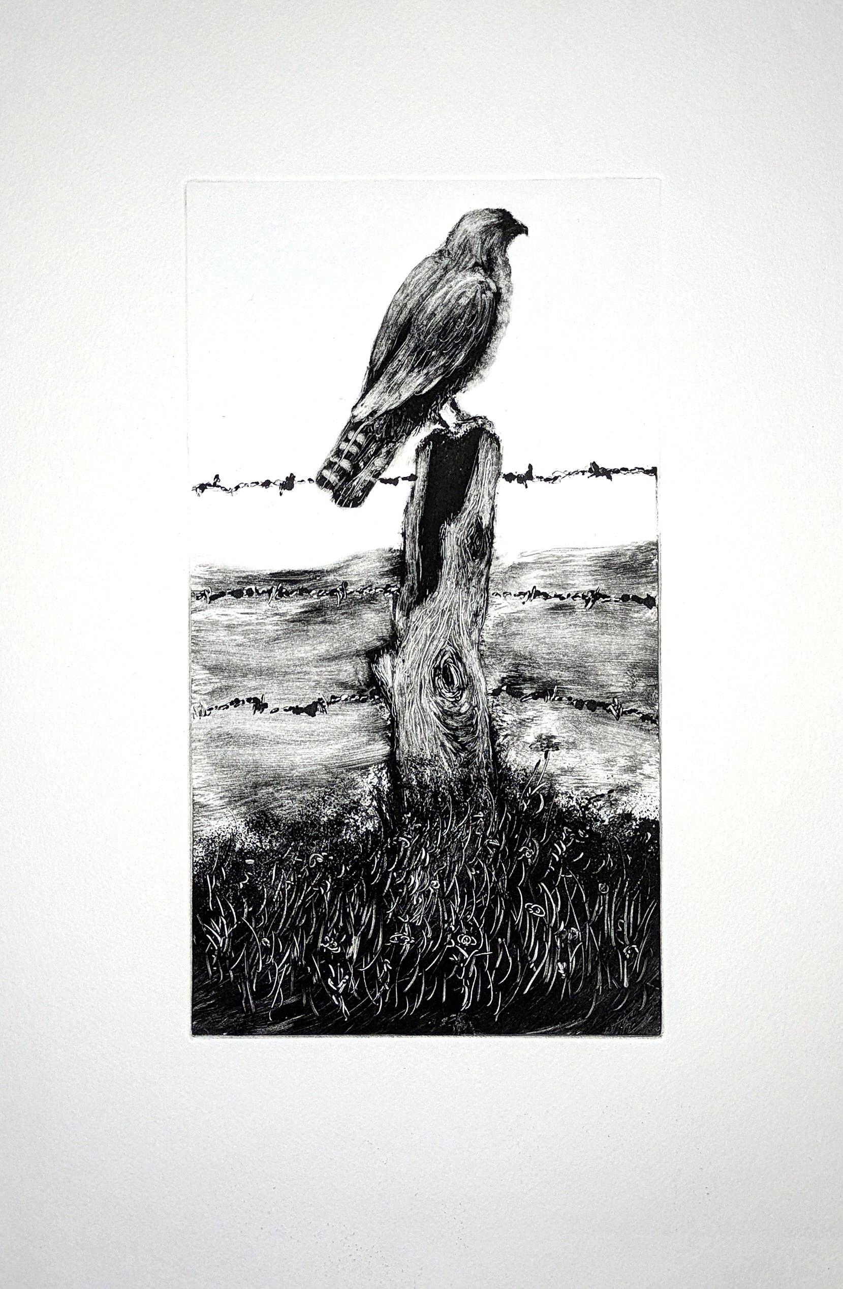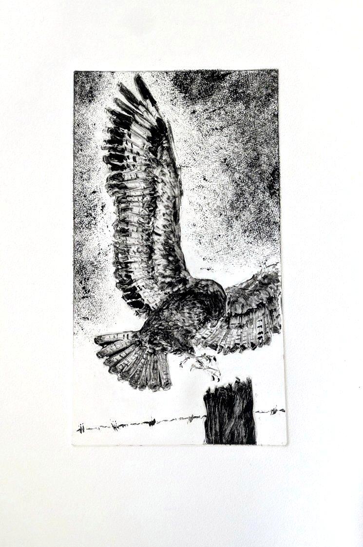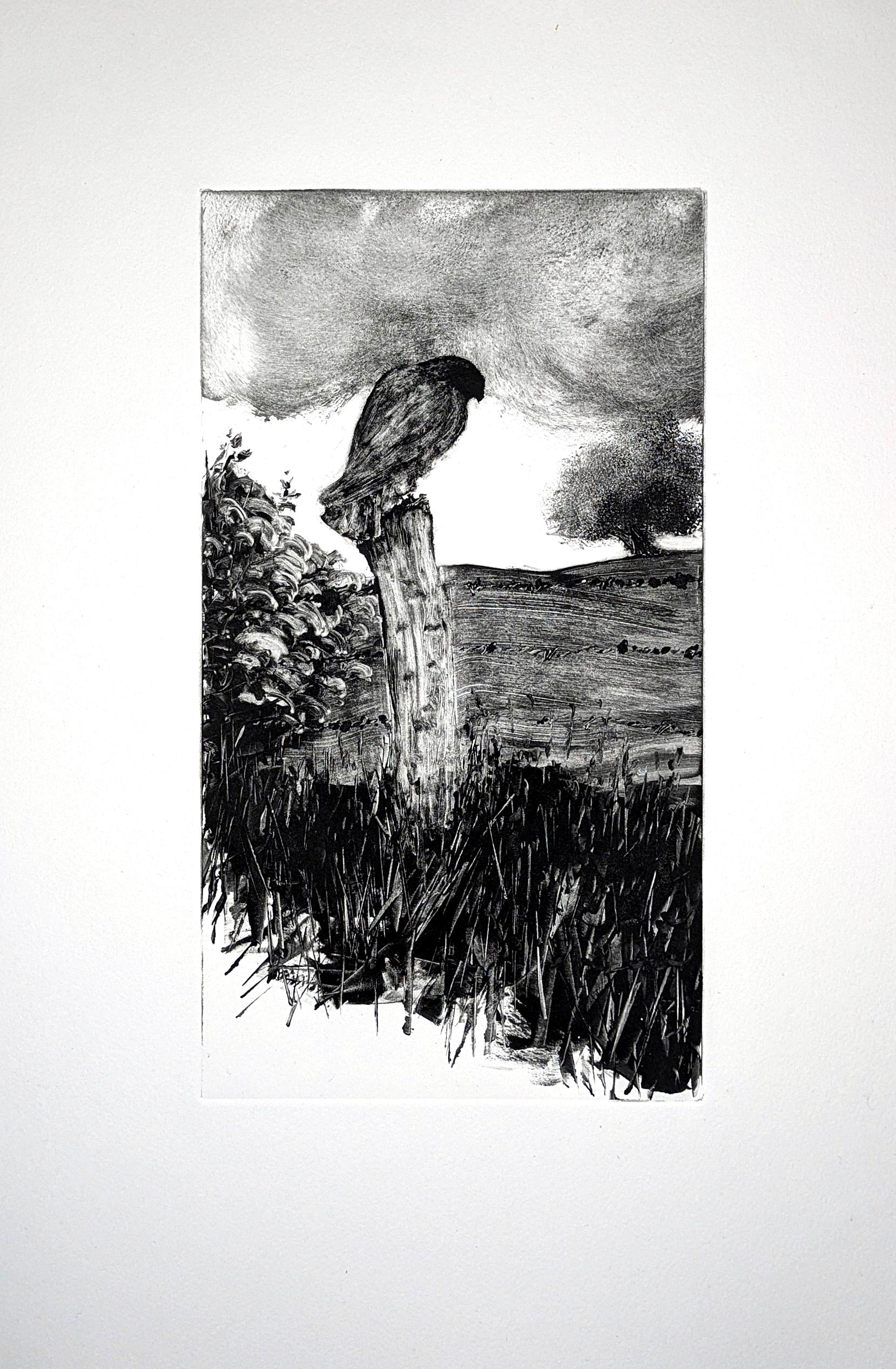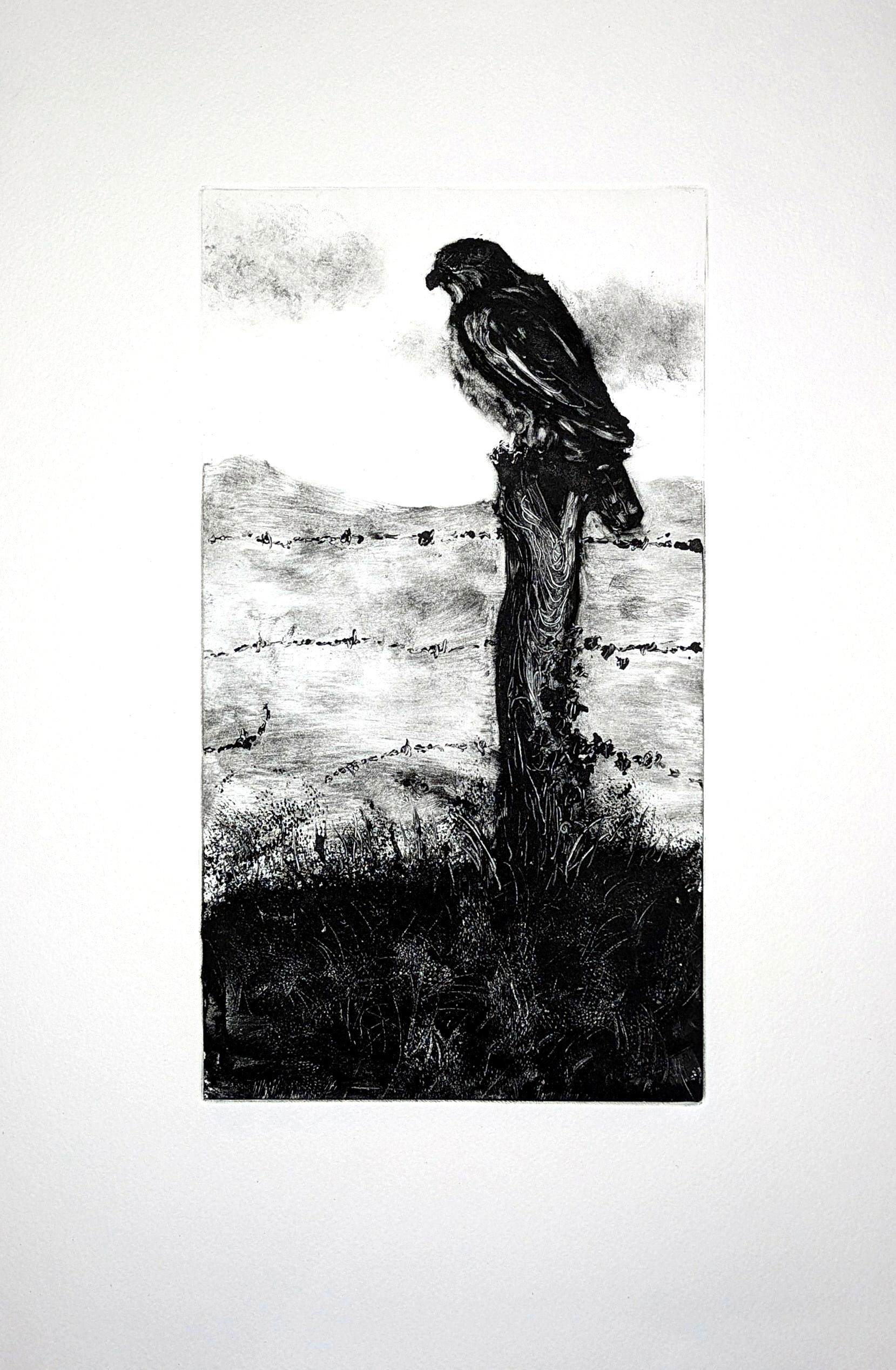 J’avais une plaque de cuivre vierge dont j’aimais bien le format, assez grand et allongé, que j’ai décidé de réserver au monotype. Et pour le sujet du premier essai, j’ai ressorti une de mes vieilles obsessions depuis l’enfance : les buses, posées d’un air à la fois bourru et altier sur les poteaux de barbelés au bord des routes.