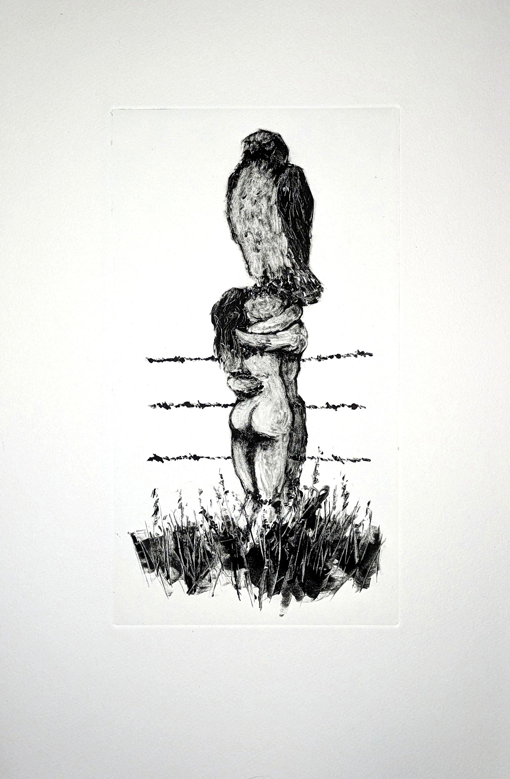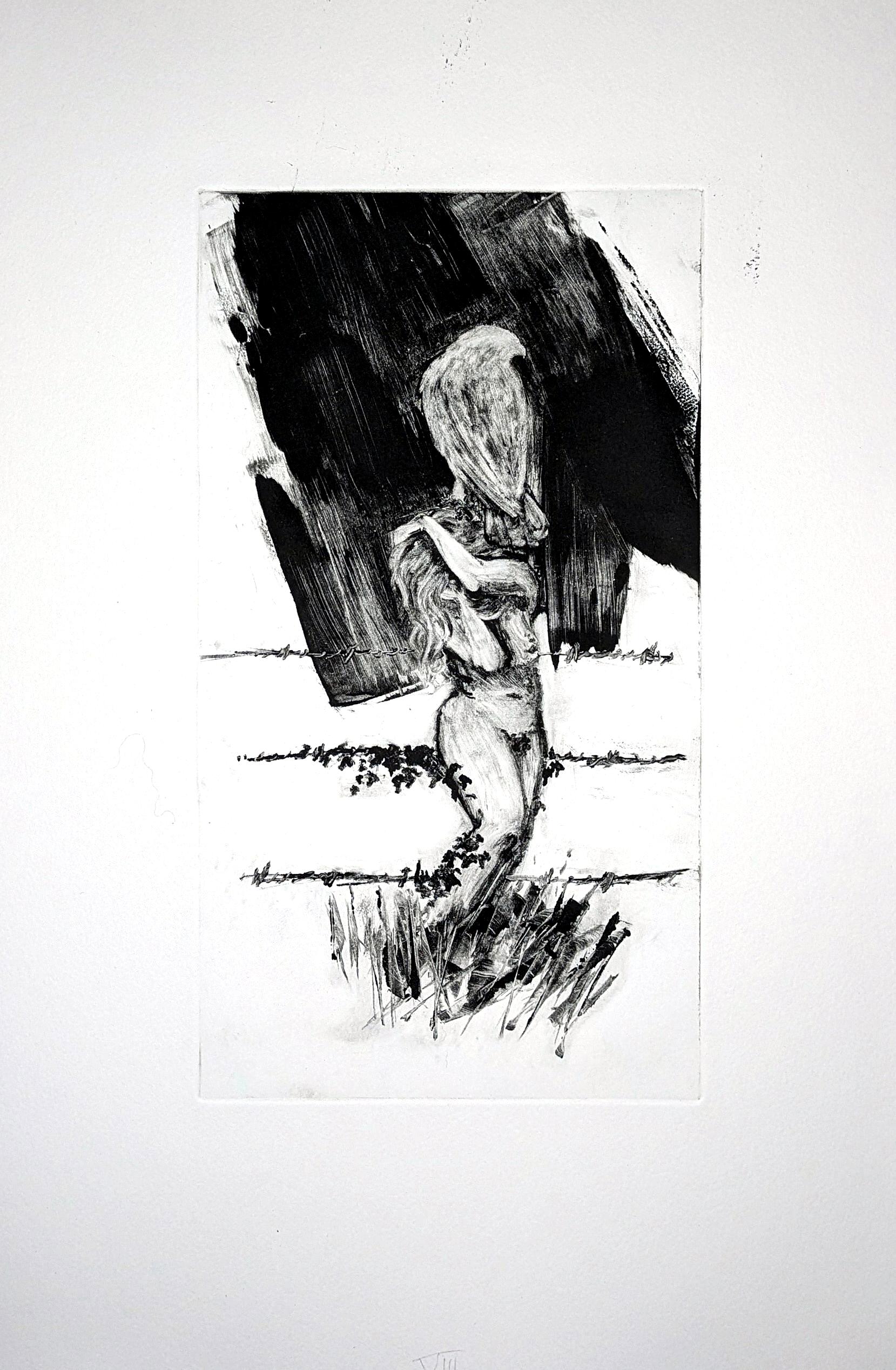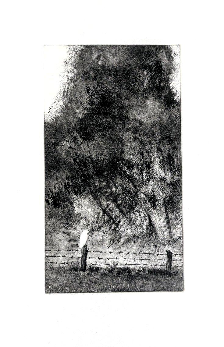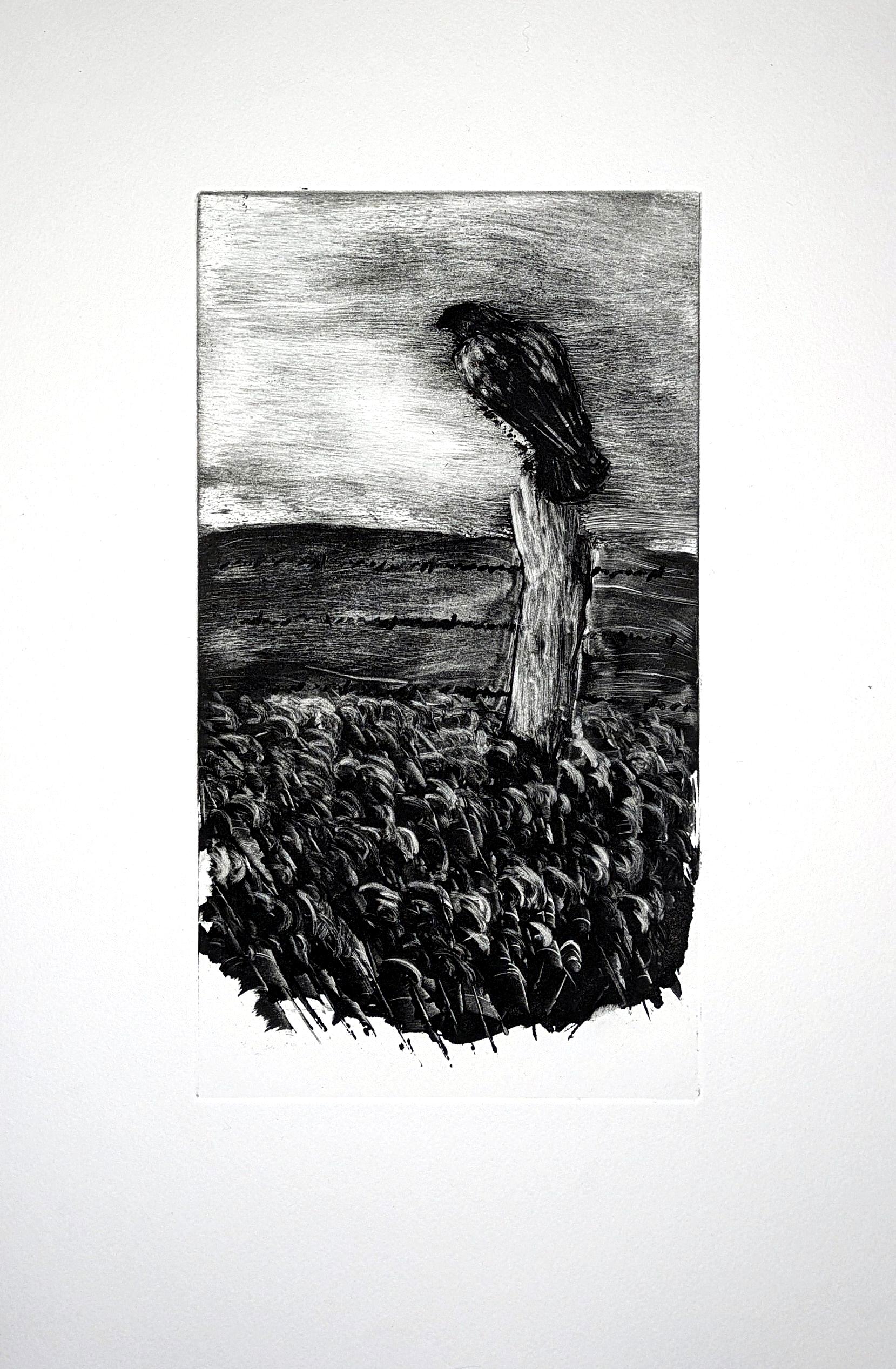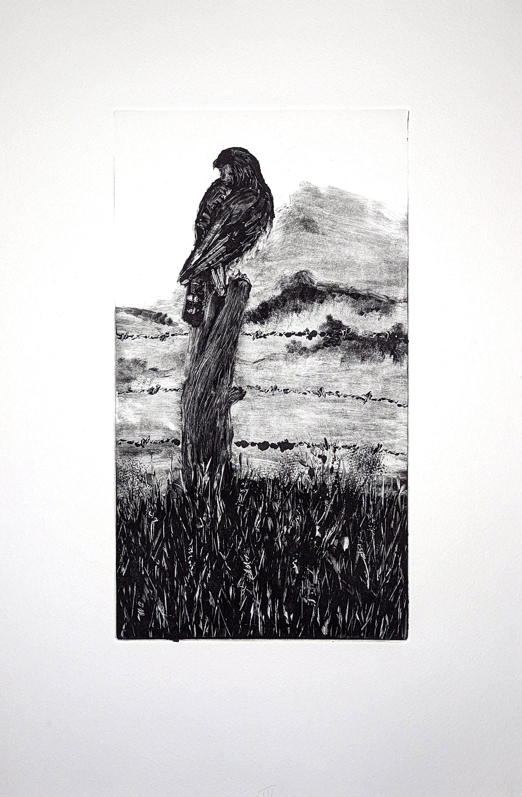 J’avais une plaque de cuivre vierge dont j’aimais bien le format, assez grand et allongé, que j’ai décidé de réserver au monotype. Et pour le sujet du premier essai, j’ai ressorti une de mes vieilles obsessions depuis l’enfance : les buses, posées d’un air à la fois bourru et altier sur les poteaux de barbelés au bord des routes.
