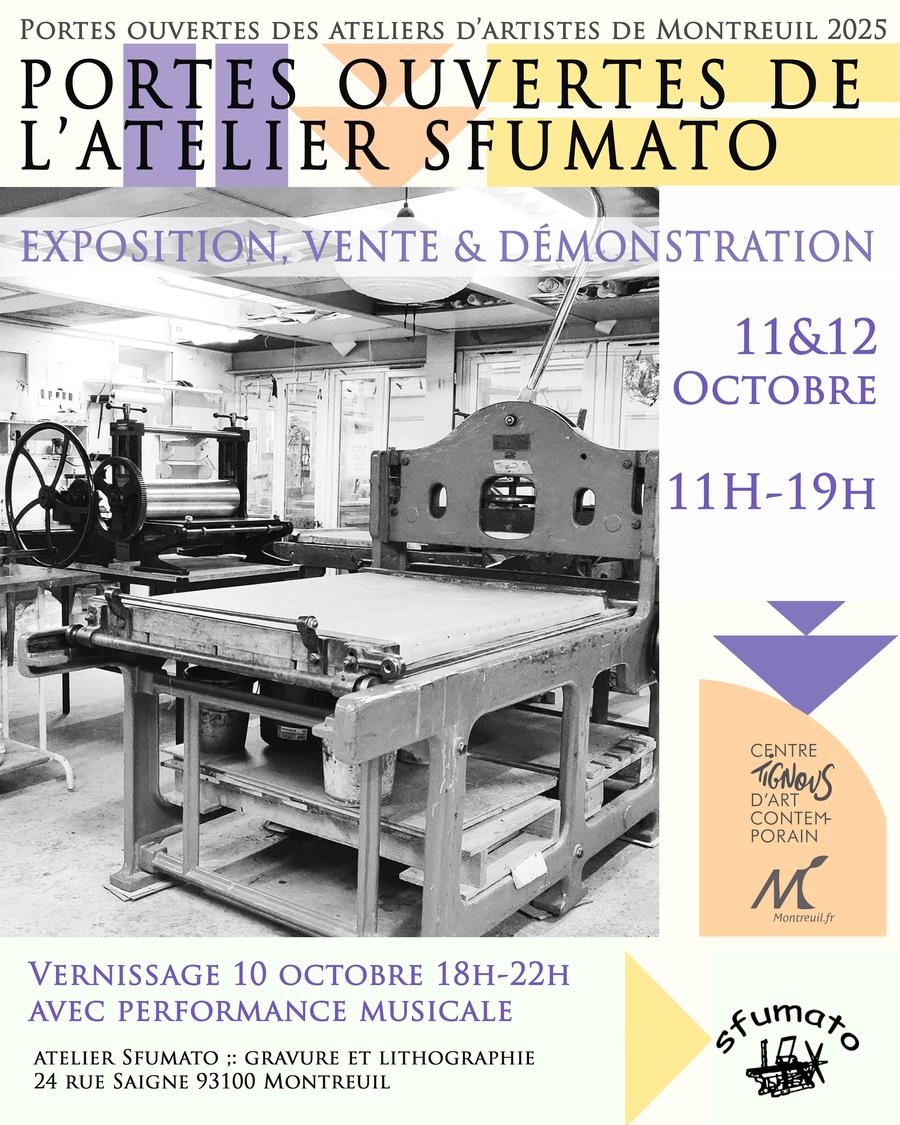 Pour ma part, je serai cette année encore avec d’autres artistes à Sfumato, l’atelier auquel je suis adhérent (et qui partage ses locaux avec des ateliers de sculpture qui seront aussi ouverts). On présentera les lieux, les presses, on fera des démonstrations, on répondra à toutes les questions. Il y a aussi une petite expo (tiens d’ailleurs il faut que je choisisse ce que j’y mets…), qui montre très bien la variété des styles et des techniques qu’on pratique dans cet atelier : toute la taille-douce, mais aussi lithographie, gravure en relief, photo-gravure, mokulito, etc.