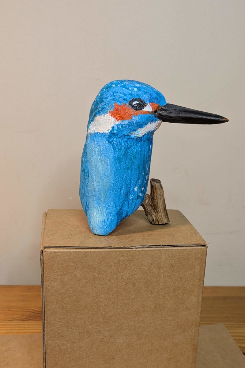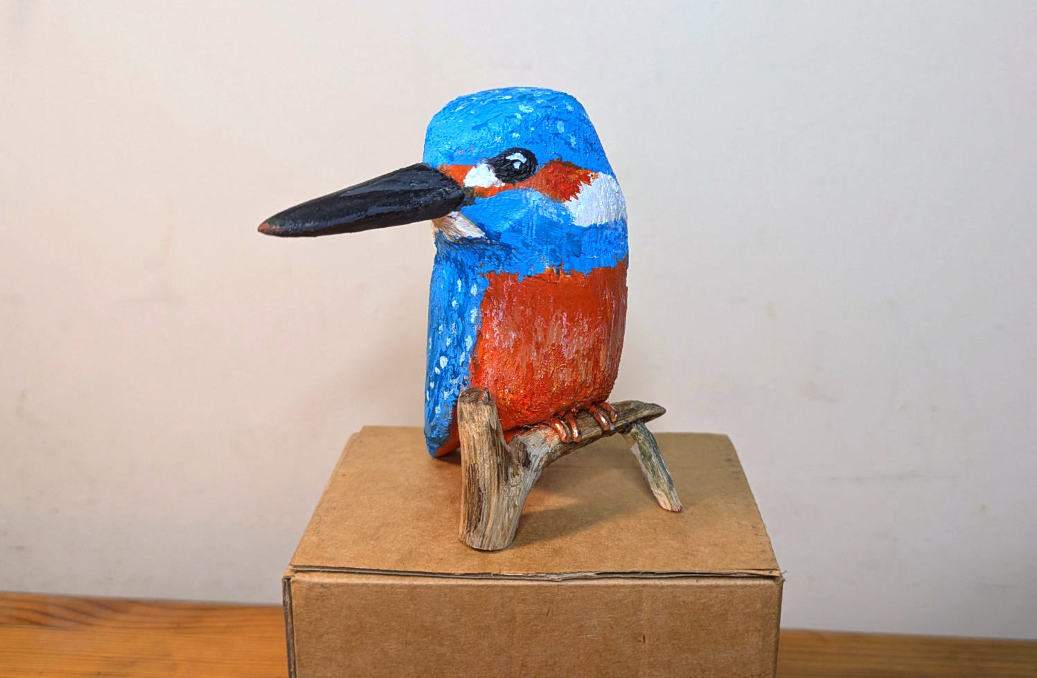 Quelques heures de façonnage à la râpe sur un tasseau en pin pour obtenir la forme générale, un autre bout de bois pour le bec, une branchette pour le perchoir et quatre bouts de câbles électrique dénudé pour les toutes petites pattes de cet oiseau, et voilà ! Pour la peinture, juste un peu d’acrylique sans lésiner sur la pétance des couleurs, parce qu’on parle quand même d’un martin-pêcheur.